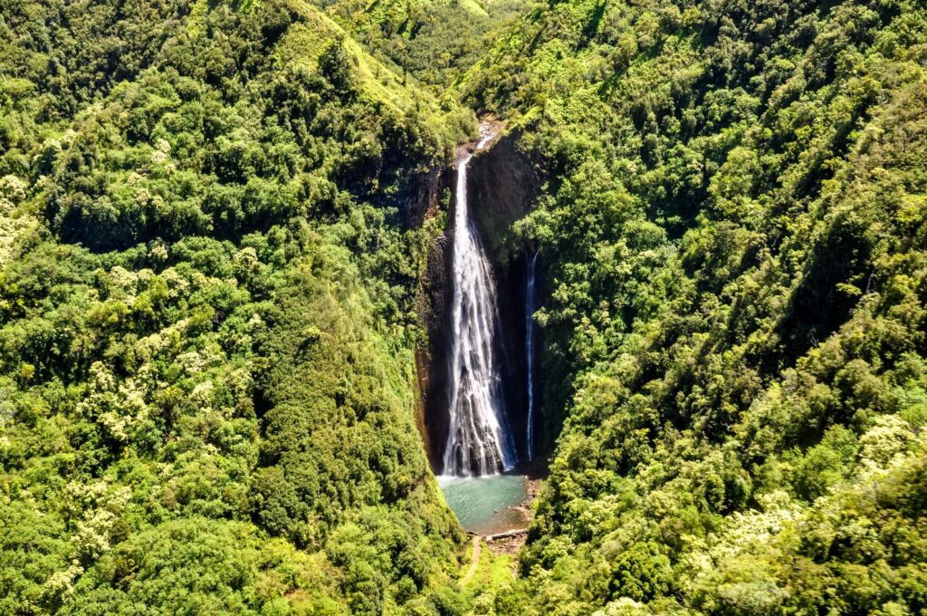 Yes, that waterfall. The one from Jurassic Park. Only helicopters can get you close, and the flight itself is worth the ticket — cliffs, valleys, emerald ridges, all unfolding beneath you. Touch down at the base and you’ll understand why Hollywood keeps coming back to Kauai.
